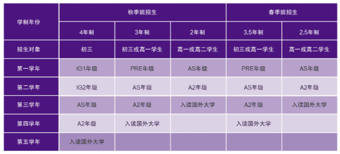 根據(jù)美高學(xué)校官方信息,目前學(xué)校的A-Level課程分為春季班、秋季班,春季班學(xué)制為2.5年制、3.5年制,秋季班為2年制、3年制、4年制。