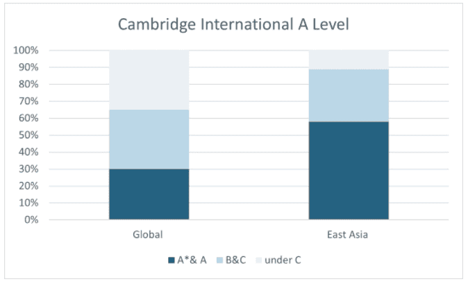 而東亞地區(qū)的A*&A率高達(dá)58%,高出全球28%,也與中國考生IB均分高出全球考試均分這一點(diǎn)是一致的,就是因?yàn)橹袊忌目荚嚹芰ζ毡檩^高。